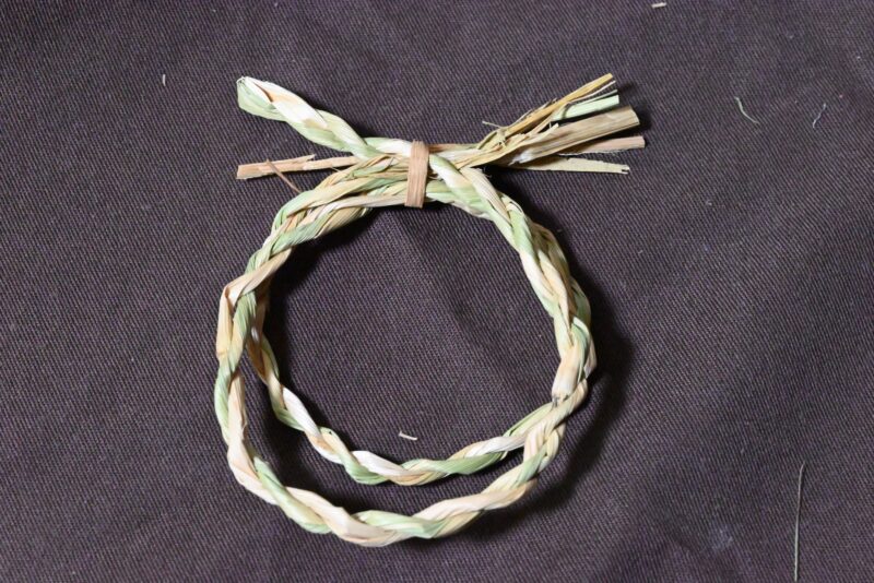 それぞれの束を時計回り、全体を反時計回りにねじることで途中でほどけないまっすぐなしめ縄ができます。