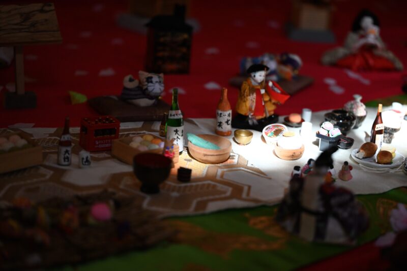 大きな雛壇にぎっしり並ぶ雛人形(公式サイトによるとおよそ1000体)は華やかで見応えがありましたがさらに面白かったのがその下段。